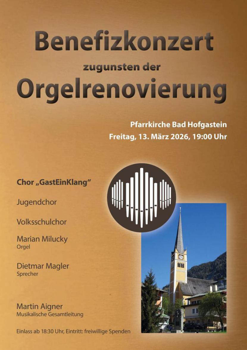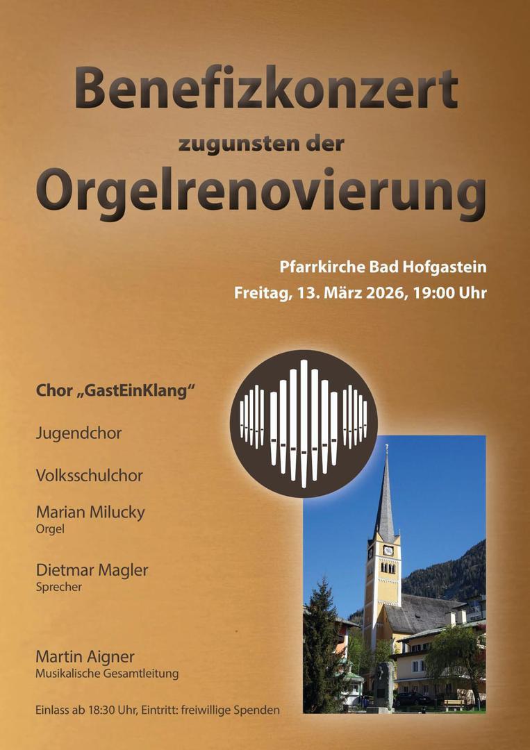 Gerne wollen wir die Pfarre bei der Erstrahlung dieses wertvollen Instrumentes unterstützen! Deshalb veranstaltet der Chor GastEinKlang ein Benefizkonzert zugunsten der Orgelrenovierung in der Pfarrkirche Bad Hofgastein! Weiters wirken der Chor der Volksschule Bad Hofgastein, der Jugendchor und Marian Milucky an der Orgel mit!